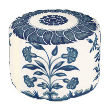 Antique Chinese Blue and White Leaf Pattern Pouf