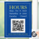 Store Hours Open Sign with QR code for store entry door or window in white and yellow text on dark blue background with QR code message.