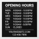Display your schedule clearly with this simple, professional opening hours window cling featuring crisp white text on a bold black background in a convenient 12"x12" size. Designed for small business use, this minimalist layout keeps information easy to read while maintaining a clean, modern look. Add your opening hours, plus extra details like your website, phone number, or special messages at the bottom. Ideal for storefront window decals and everyday business signs, all text can be fully changed to match your needs.