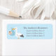 A return address label that has a cartoon of a stork carrying a polka dot bundle with a cute baby boy wrapped up inside. Pastel blue colour palette is great for baby boy showers and newborn announcements!