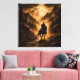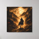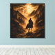 The final chapter in the Gothic Western saga finds our lone rider navigating a treacherous mountain pass under a lightning-filled sky. As the storm rages, the same mysterious glowing eyes watch from the shadows of the peaks, signaling that the journey is far from over. This square canvas is rendered with a heavy, weathered burlap grain finish, providing an antique and rugged textile aesthetic. The high-contrast amber lighting and dramatic silhouettes create a powerful, open-ended conclusion to the series.