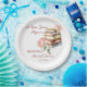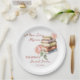 Story book new chapter bridal shower monogram printed paper plates template personalized tableware, books reading themed bridal shower plates personalized table decor, watercolor pile of books and blush roses casual handwriting font bridal shower theme for bookworms