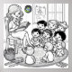 Engage children with this charming coloring poster that depicts young kids gathered in a reading circle on a rug, as an adult reads a book to them. It showcases a diverse group of children listening intently to a story. A little bookworm accents this design.