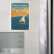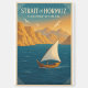 Travel poster of the Strait of Hormuz, Oman. Majestic seascape with deep blue waters and traditional Omani wooden dhow sailing across, its white sail catching the wind. Rugged golden cliffs and mountains rise in the background, with warm desert light glowing.