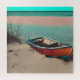 AI generated red boat on a sandy beach with turquoise waters puzzle. soft colors.