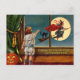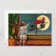 A beautiful vintage Halloween card featuring a child watching a flying witch through the window.
