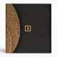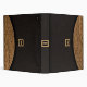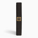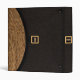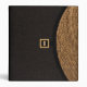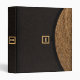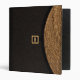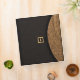 This all purpose binder is designed to look, when folded, like a clutch handbag or purse. When held horizontally, the top of the "bag" has a curved flap closure of woven straw (a photograph), and the rest is covered in a dark, almost black textured fabric. In the center is a black square with a gold border like a clasp, with a black strip back to the straw flap. Inside the gold border are initials, a monogram, which can be personalized or deleted. The gold monogram also appears on the back and the spine.