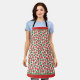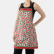 Strawberries apron designed with a multi-directional pattern of illustrated strawberries, and red and green stripes along the top and bottom edges. This strawberry apron is perfect for anyone who loves strawberries and cute summer fruit designs.