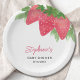 This baby shower paper plate is decorated with a bunch of watercolor strawberries and stylish script typography.