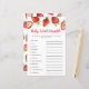 Cute strawberry theme baby shower baby word scramble card featuring watercolor illustration of strawberry fruit. The list of words on this card are all related to babies and they are scrambled. The guests are going to compete who can unscramble all of them first! ANSWER KEY: 1. car seat 2. milk 3. playpen 4. pacifier 5. diaper 6. rocking chair 7. nursery 8. baby monitor 9. swaddle 10. formula 11. rubber ducky 12. stroller.