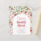 Berry first birthday invitations for your little one's big day! This design features a groovy pattern of strawberries and flowers against a blush pink background, with a boho arch overlay for the text. The birthday girl's name is written in fun script lettering with "berry first" in retro typography. This design can be used for garden parties, tea parties, farm-themed or farmer's market parties, picnics, or any other summer celebration! As part of Zazzle's budget selection, this sheet doesn't come in standard card sizes. To get this design on a standard card, you can find it in the collection or use the Zazzle Make Machine to transfer it onto your preferred product. View the collection linked on this page for matching items or visit our store for more first birthday party invitations.