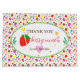 This cute, colorful birthday party gift bag features little red and pink strawberries and red, pink, yellow and green love hearts. The front reads "Sandie's first birthday" in brown script, and "Thank you" and red "berry much" in calligraphy script at the back. You can personalize your name and birthday. The background is a strawberry and love hearts pattern.
