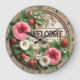 Welcome guests with the charm of the countryside using this delightful wall clock. It features a "WELCOME" message surrounded by beautiful pink and white morning glories, lush greenery, and ripe strawberries, all set against a rustic burlap-style background and rope border. Perfect for kitchens, entryways, or any space needing a touch of garden-fresh appeal.