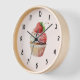 A clock with a yummy illustration featuring a delicious looking cupcake. White cream and a big strawberry adorn this yummy sweet treat.