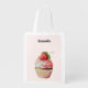 Grocery tote with a yummy illustration featuring a delicious looking cupcake. White cream and a big strawberry adorn this yummy sweet treat.