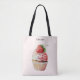 A tote bag with a yummy illustration featuring a delicious looking cupcake. White cream and a big strawberry adorn this yummy sweet treat.