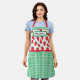 Fun, colorful apron features a strawberry pattern and a green and white gingham check plaid on the bottom. A panel at the top, lined with green trim allows you to personalize the apron however you like. A matching pot holder, oven mitt and kitchen towel are also available.