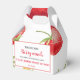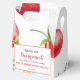 Adorable strawberry-themed birthday party favor box with a watercolor painting of the juicy red fruit of summer. "Thank you very much for attending my party," the message reads. Ideal for a summertime girl's party.