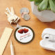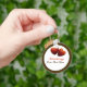 An image of heart shape strawberries on a keychain. The keychain has customizable templates for your text.
