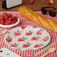 Strawberry paper plates with matching paper napkins. See more mix and match products in the Strawberries Collection at https://www.zazzle.com/collections/strawberries_collection-119030629393964165