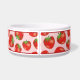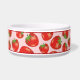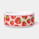 Fruity pattern of red and green color strawberries together with a personalizable text area for a name or other custom text such as "food" or "water", for example. The background color is light pink and the top and bottom have red color borders. This playful pattern of strawberries is great for pet owners whose pet's name resembles the word: "Strawberry" or simply "Berry", for example. It is also a fun design for the summer time or for anyone looking to add a pop of red color to their space. The combination of the colors red, pink and green flow well together and make this design a true treat to look at.
