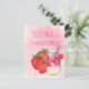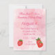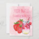 Card features watercolor strawberries with the words 'strawbery picking party party you're invited' . On the back you can add all your personal information. Watercolor of Mason Jar cherry drink to give this invitation a feel of summer fun.