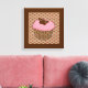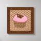 Strawberry Pink Frosted Cupcake topped with a chocolate butterfly in a decorative, chocolate brown damask patterned cupcake wrapper, on a brown, tan and coral pink Chinese scalloped background poster