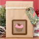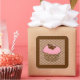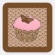 Sticker in a Strawberry Pink Frosted Cupcake topped with a chocolate butterfly in a decorative, chocolate brown damask patterned cupcake wrapper, on a brown, tan and coral pink Chinese scalloped background