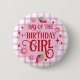 A cute pink gingham and watercolor strawberry 'dad of the birthday girl' button for your to match with your birthday girl and let your guests easily identify you at your daughters birthday party, ready for you to customise today.