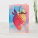 This image is a vibrant, colorful risograph print of a strawberry, featuring a blend of pink, blue, and yellow hues. The artwork has a stylized, almost pop-art aesthetic with dynamic, abstract background elements.