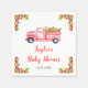 This cute and fun watercolor baby shower napkin features a pink rustic truck full of strawberries. The text combines handwritten script and sans serif fonts for a stylish and modern look. This is perfect for a summer baby shower.