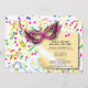 Confetti on the back of this party invitation card. Party streamers and confetti on the front of the card. A face mask and a note to come to the party. Celebrate the New Year with this fun New Year's Eve party invitation. Fill in the information for your party gathering.