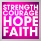 Strength, Courage, Hope and Faith inspirational words on a poster design featuring a gradient pink background.