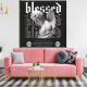 This evocative art print combines a classic angel sculpture with contemporary gothic typography. The word "blessed" is displayed prominently, inviting contemplation and reflection on faith and spirituality.