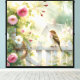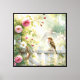 A soft watercolor scene captures a gentle songbird resting on a white garden fence surrounded by blooming pink roses, leafy vines, and warm morning light. The palette glows with pastel greens, blush pinks, creamy whites, and sunlit gold, creating a calm cottagecore atmosphere filled with quiet charm. Loose painterly brushstrokes and airy light give the artwork a whimsical folk feel, evoking peaceful garden mornings, vintage storybook illustrations, and romantic shabby chic beauty. AI generated artwork.