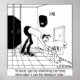 A man in a bathroom with a really low sink and mirror who is bent over so far his nose almost touches his toes says, “At least I get my stretching exercises done when I use the restroom here.”