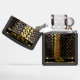 The intricate texture of a black and gold snake skin captivates the viewer with its mesmerizing patterns. The glossy scales shimmer in the light, showcasing vivid contrasts between dark and metallic hues. MONOGRAM ADD YOUR NAME