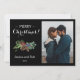 Striking, black Christmas card customized with your favorite photo. Personalize with your names and the year on the left. Beautiful watercolor holiday bouquet with pine boughs, red berries, and pinecones. Reverse side is solid black with another arrangement of holiday greens, berries, and brass bells.
