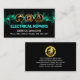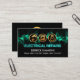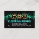 A blue electrical lightning wave streaks across the card's face zapping through three gold electrical icons. Below this gold creation is the business name in green followed by your prestigious name and the contact details.
