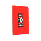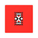 This artwork features a prominent rectangular geometric pattern composed of triangles and squares in red, black, and white. The design is symmetrical and creates a striking visual effect, with a central "X" shape formed by red and white triangles. The pattern is set against a solid red background.