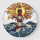 This round clock features a stylized illustration of a red and white striped lighthouse standing amidst swirling blue and white waves. A large, vibrant sunburst in warm yellows and oranges radiates behind the lighthouse. The clock face has clear numerals and black hands. The overall design is bold and graphic, evoking a sense of maritime adventure and sunny days by the sea.