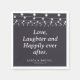 These string light love laughter and happily ever after napkins are perfect for a rustic wedding. The design features an elegant font in a purple background.