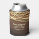 romantic and rustic wedding koozie cooler with string lights and barn wood.