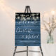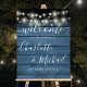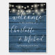 Featuring pretty string lights and signature style names, this elegant rustic welcome sign can be personalized with your information in chic lettering on a blue wood panels background. Designed by Thisisnotme©