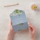 This all-in-one wedding invitation features pretty string lights and botanical greenery falling across elegant typography on a dusty blue background. The invitation includes a perforated RSVP card featuring a QR code. Designed by Thisisnotme©