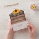 All in one wedding invitation featuring pretty sunflowers, string lights, mason jars, signature style names and chic typography on a rustic wood background. The invitation includes a perforated RSVP card with meal choice. Designed by Thisisnotme©