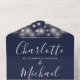 All in one wedding invitation featuring pretty string lights and elegant signature script name and monogram initials on a navy blue background. The invitation includes a perforated RSVP card with your wedding website QR code and details. Designed by Thisisnotme©