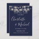 Featuring pretty string lights and signature style names, this elegant navy blue and white save-the-date card can be personalized with your special wedding day details in modern white lettering. Designed by Thisisnotme©