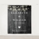 This string lights rustic black wood boho barn wedding backdrop can be personalized with your information in chic typography. Designed by Thisisnotme©