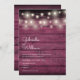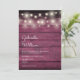 A stylish rustic wedding invitation featuring pretty string lights above the happy couple's names set in an elegant script above the special wedding details on a rustic burgundy red wood background. The reverse features a matching rustic wood background. Designed by Thisisnotme©